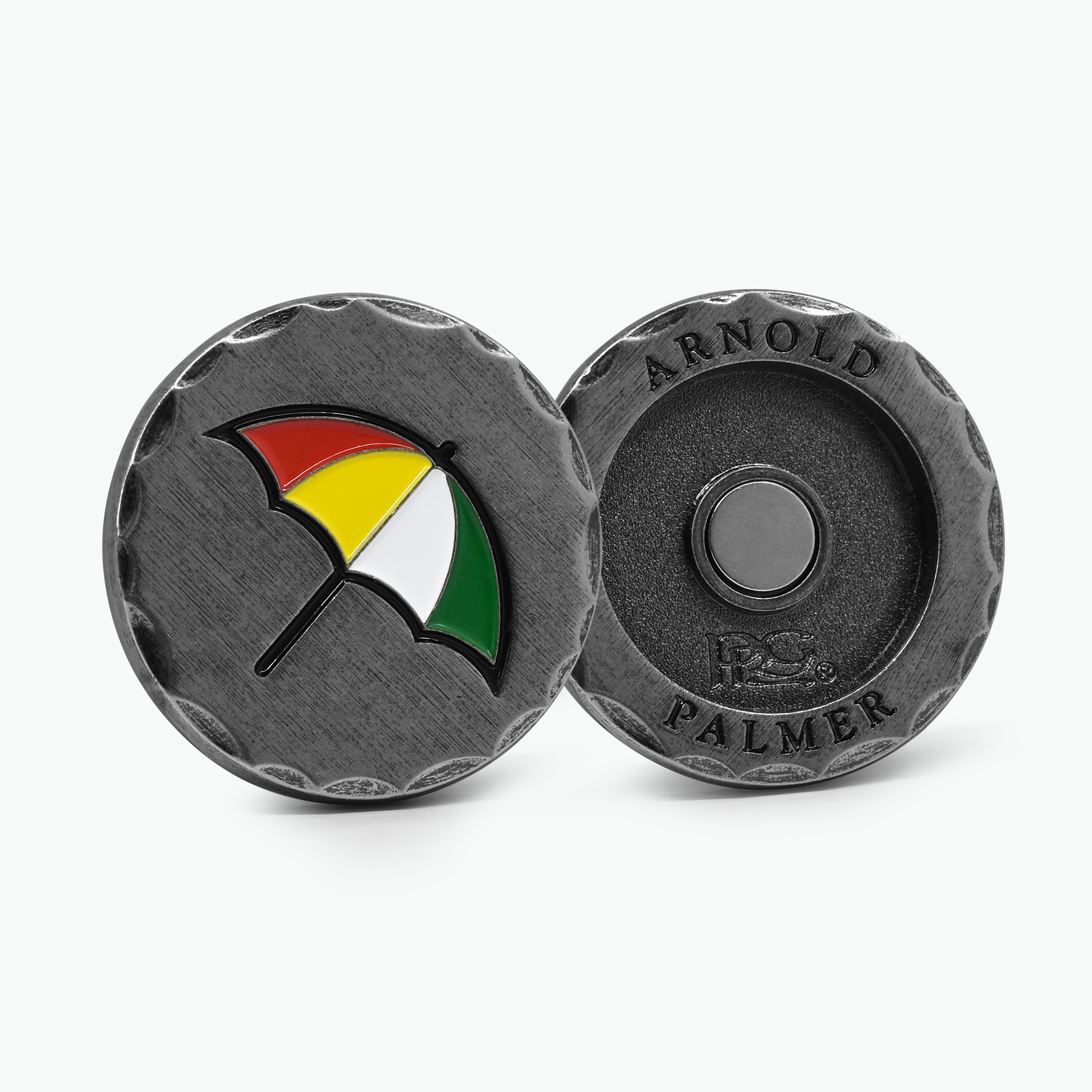 PRG Golf is excited to announce the launch of our new Arnold Palmer collections for 2025! This chiseled duo ball marker showcases the iconic Arnold Palmer umbrella in full color fill on an antique style metal with a chiseled edge and a strong magnet on the front to house the mini chiseled marker making this modern take on a vintage classic truly one of a kind! Chiseled Duo Marker comes pre-packaged in a custom green Arnold Palmer window box.