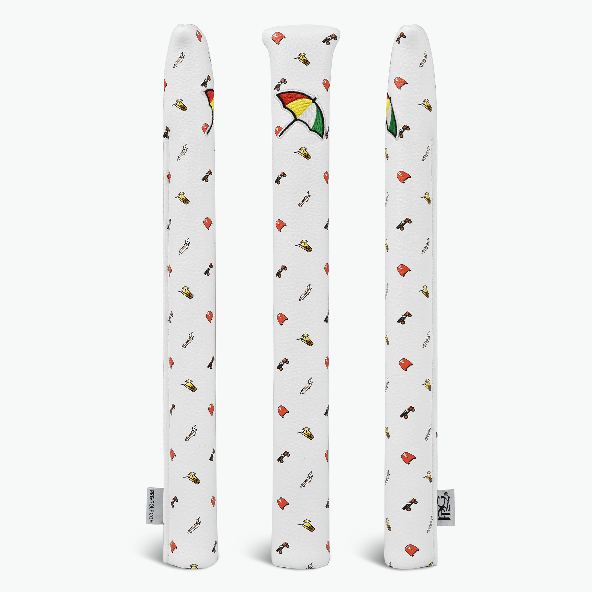 PRG Golf is excited to announce the launch of our new elite Arnold Palmer collections for 2025! The Alignment Stick Cover from this unique collection includes an all-white base with some of Arnie's most popular icons made into a custom micro print design while showcasing the iconic Arnold Palmer umbrella in full color embroidery on top, making this collection truly one of a kind!
