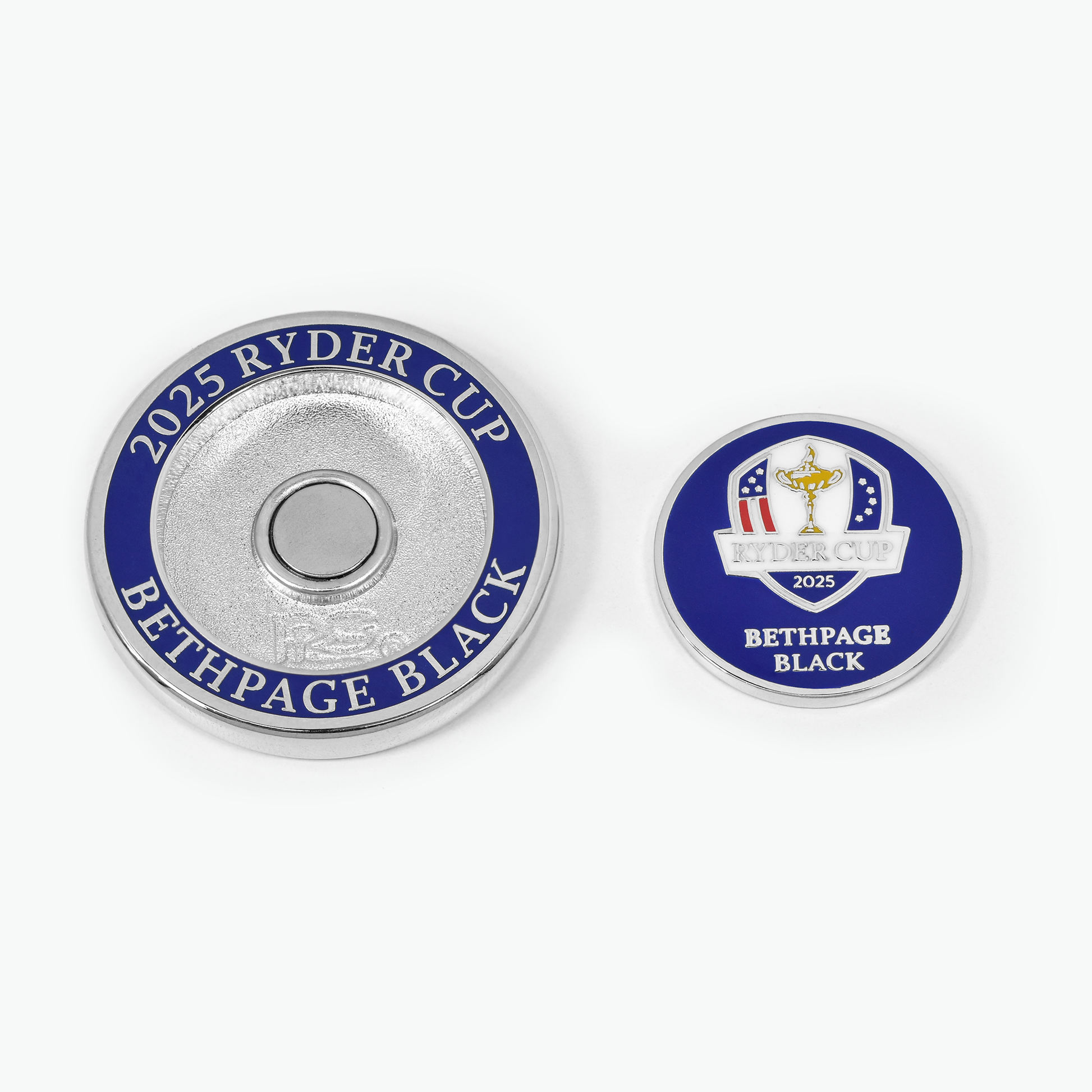 Show your Ryder Cup pride and get your Official Duo Ball Marker of the 2025 Ryder Cup at Bethpage Black! This unique design includes 35mm larger outer ball marker with removable magnetic 24.5mm two-sided inner ball marker. Nickel finish with hard enamel color fill.