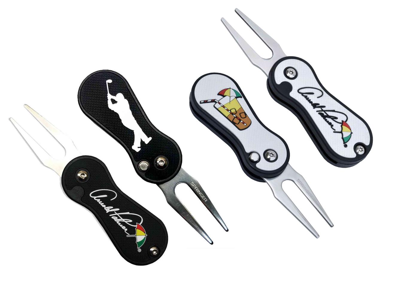 Officially licensed Arnold Palmer® custom golf accessories made by PRG. Custom PVC Springer divot repair tool. White version features the iconic Arnold Palmer signature and umbrella on one side and the famous iced tea on the other side. Black version features the iconic Arnold Palmer signature and umbrella on one side and Arnold Palmer's iconic swing silhouette on the other side.