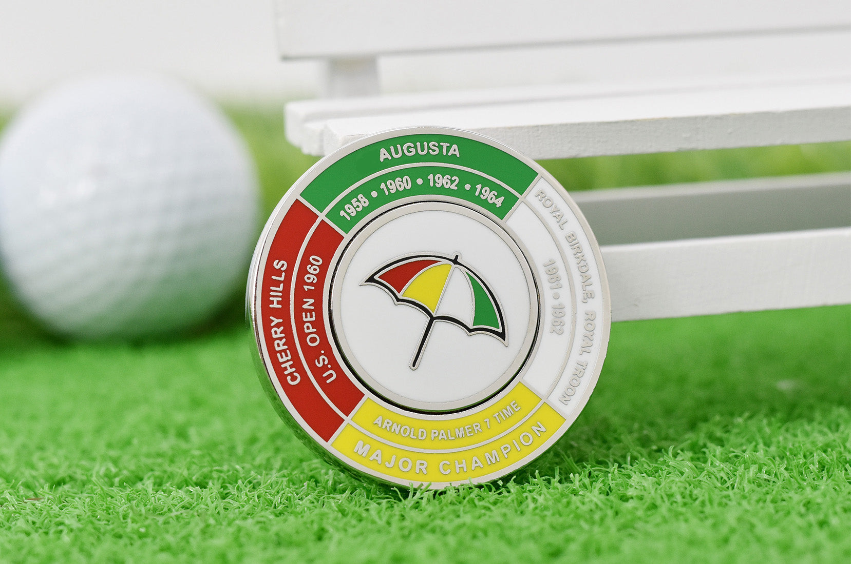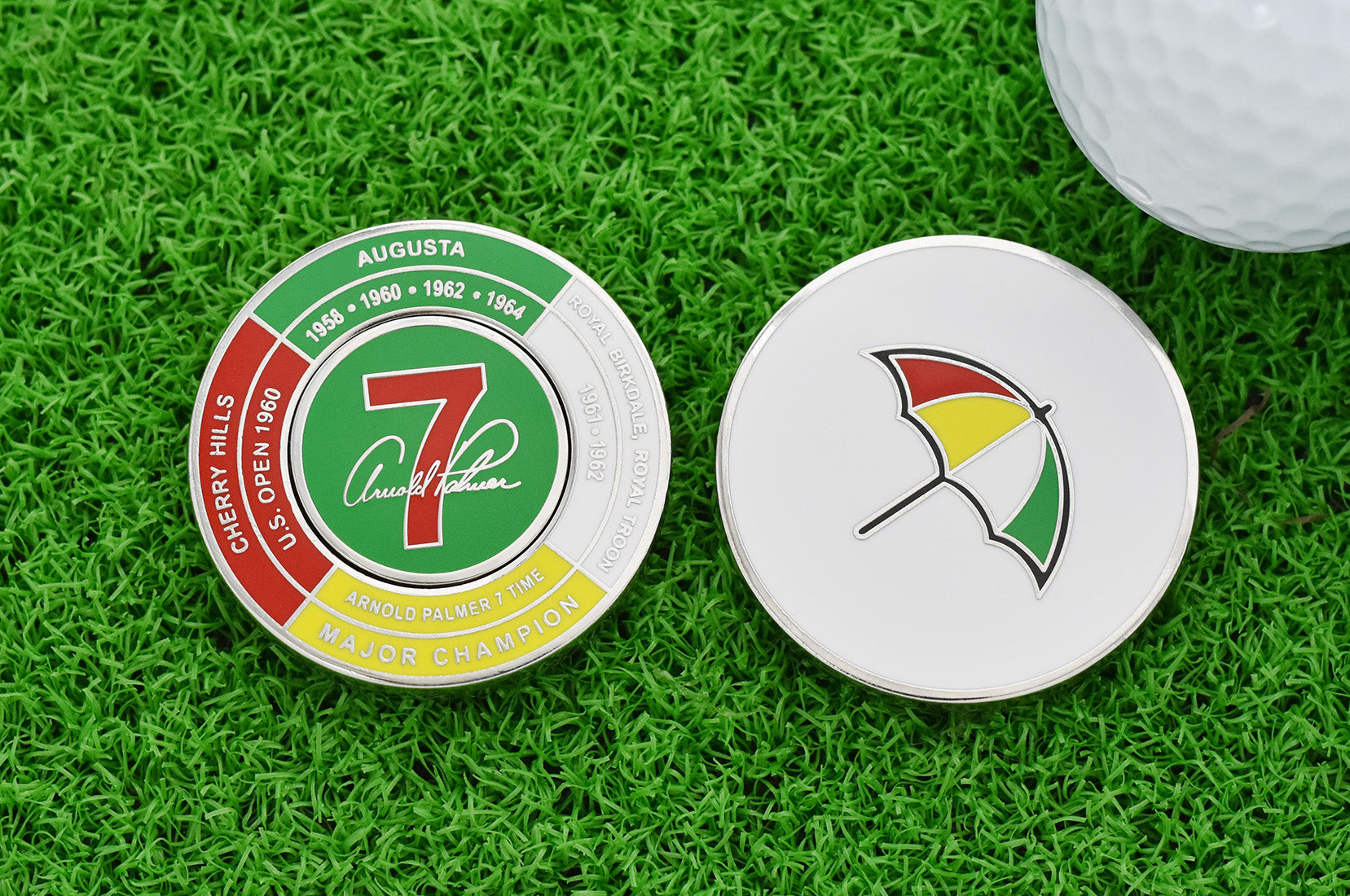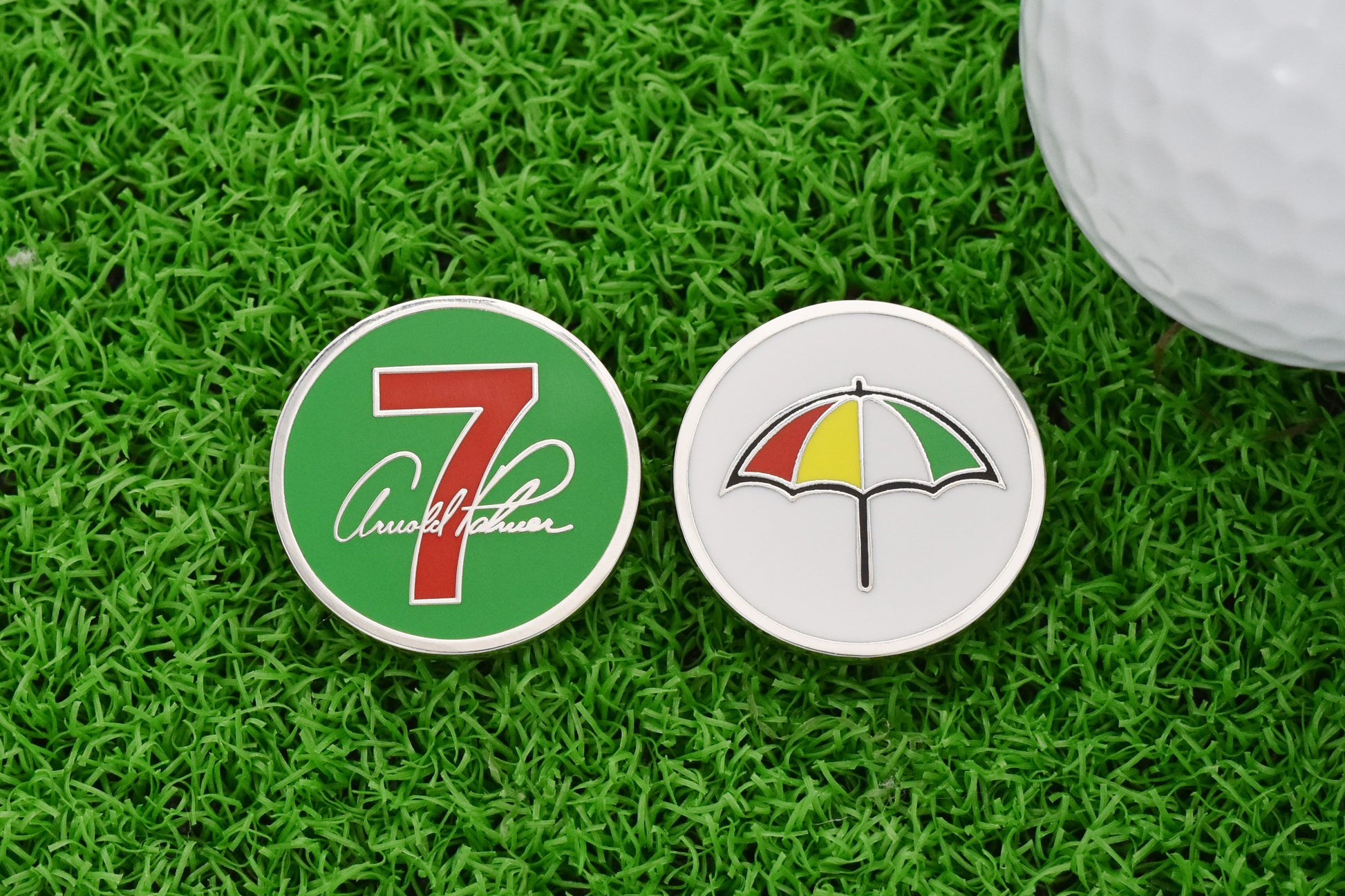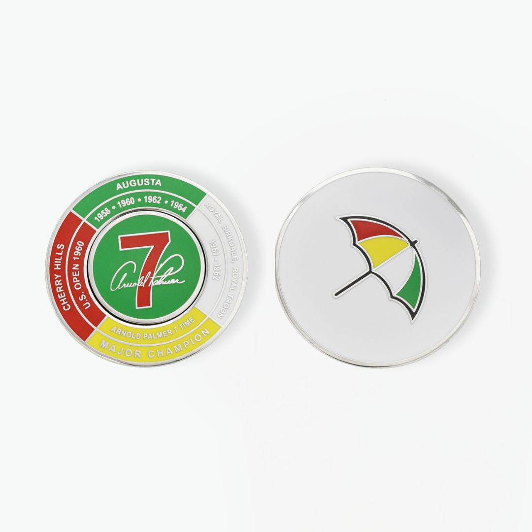 Officially licensed Arnold Palmer® custom golf accessories made by PRG. Oversized Duo ball marker with removable inner mark featuring iconic Arnold Palmer umbrella on one side and 7 signature on other side representing his 7 major championship wins.